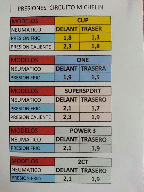 #4•• Buena iniciativa la de recoger opiniones de neumáticos. Yo monto neumáticos de categoría más baja, lo que viene siendo sport y no racing. Soy un enamorado de los Power 2ct, aunque tienen sus inconvenientes. El delantero es muy triangular, hace que la moto se caiga dentro de la curva y haya más goma en contacto con el suelo una vez dentro. El agarre para ser un neumático sport es muy bueno y para nuestras motos es adecuado por esa facilidad que otorga a la moto para entrar en curva. El delantero tiene un problema, su vida no es homogénea. En su tramo final, aún con dibujo, desfallece y pierde sus características haciendo la moto muy torpe y con poco agarre. Pero si lo conoces es un muy buen neumático. En circuito yo no los he conseguido pasar de temperatura, aunque con calor derrapan más de lo deseable incluso el delantero. Actualmente he montado delante un Power 3, que a mi juicio es menos deportivo que el power 2ct. Michelin dice que tiene una duración un 20% mayor, pero el neumático no es tan picudo y no tiene las ventajas que ofrecía su antecesor. En circuito ha dado un rendimiento parecido al power 2ct, aunque el tacto creo que es algo peor pero muy parecido. El próximo que montaré delante será el Michelin Supersport, que lo venden como 50% circuito 50% calle, con la ventaja que coge temperatura rápidamente. Me interesa porque yo necesito un neumático que funcione en frío, lluvia o dandole caña de la buena. Os dejo un cuadro de presiones michelín: