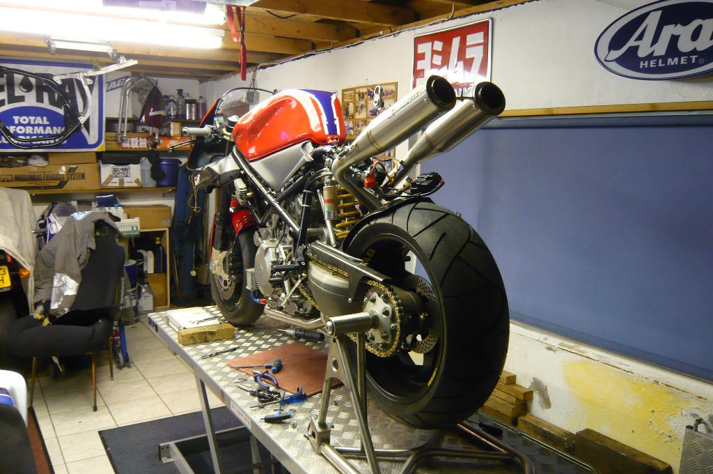 Una vez "lo más gordo" hecho, tocaba realizar un millón de pequeñas modificaciones... y otras no tan pequeñas. La bomba de agua, por ejemplo, va al otro lado en el motor japonés, por lo que había que reubicar los manguitos y el radiador. El escape había que hacerlo a medida. Había que ajustar la instalación eléctrica. La alimentación fue otro problema, al no ser válida la caja de admisión de la Ducati. En la parte ciclo se centró sobre todo en una horquilla Marzocchi de 50mm y unas llantas Dymag... curiosamente de 16" delantera (¿¿??) Los frenos delanteros son discos PFM con pinzas AP.